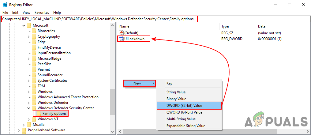 - Right-click on the right pane of the Family options key and then choose the New > DWORD (32-bit) Value option. Now name the key as “UILockdown “.