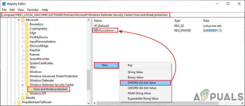 - Right-click on the right pane of the Virus and threat protection key and then choose the New > DWORD (32-bit) Value option. Now name the key as “UILockdown“.