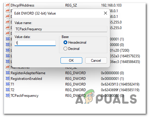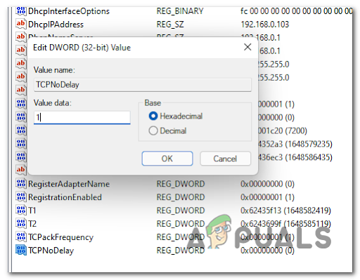 Editing the TCPackFrequency value - Repeat this process to create another DWORD (32-bit) Value called ‘TCPNoDelay’ and set its data to 1 as well.