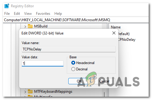 - Within the MSMQ folder, create a DWORD (32-bit) Value and name it ‘TCPNoDelay’. Then, double-click it and change the data value to 1.