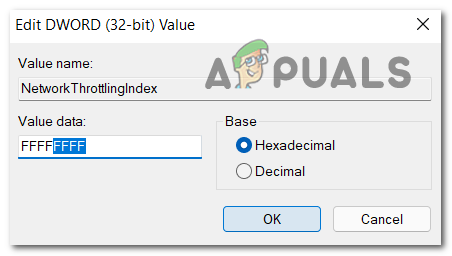Navigating to the correct location - Double-click on the NetworkThrottlingIndex value and set its data to ‘FFFFFFFF’, then click OK.