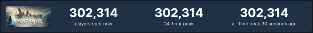 Students are flocking to Hogwarts from all corners of the world as the 72-hour early access for the Deluxe Edition of Hogwarts Legacy has begun! With the concurrent player count on Steam reaching an all-time peak of 302,314 (at the time of writing this article) and the number continues to rise, it is clear that Hogwarts Legacy is as popular as ever, despite the controversies surrounding the game. The early access concurrent player count of Hogwarts Legacy is now available on SteamDB thanks to a user who has gifted the game to the SteamDB bot.