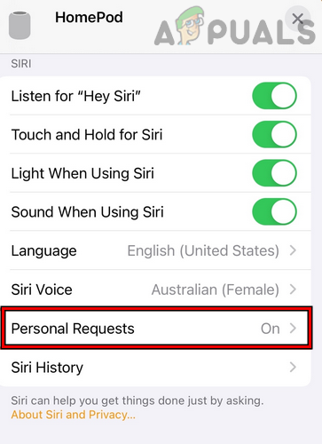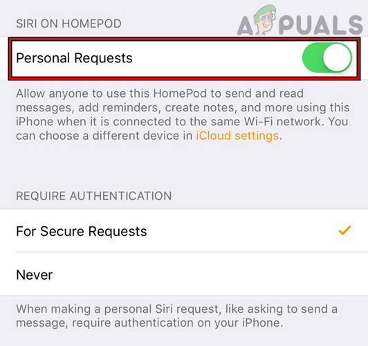 Open Personal Requests in the HomePod’s Settings - Then disable Personal Requests by toggling its switch to the off position and afterward, enable Personal Requests to check if that resolves the issue.