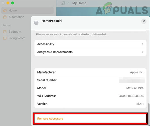 - Then click on Remove Accessory and re-add the HomePod to the Home app to check if it has started to work fine.