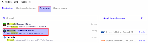 Creating Droplet on Digital Ocean - On the choose image screen, click the Marketplace tab and search for Minecraft. You will see two options. Minecraft: Bedrock Edition and Minecraft: Java Edition Server. Select the latter – Minecraft: Java Edition Server.