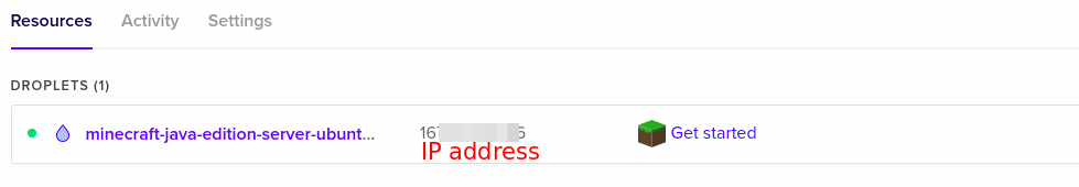 - When done, scroll down and click the Create Droplet button to start creating your Minecraft Server droplet. Once the creation process is complete, you will see your server’s public IP address that you can access from your local machine.