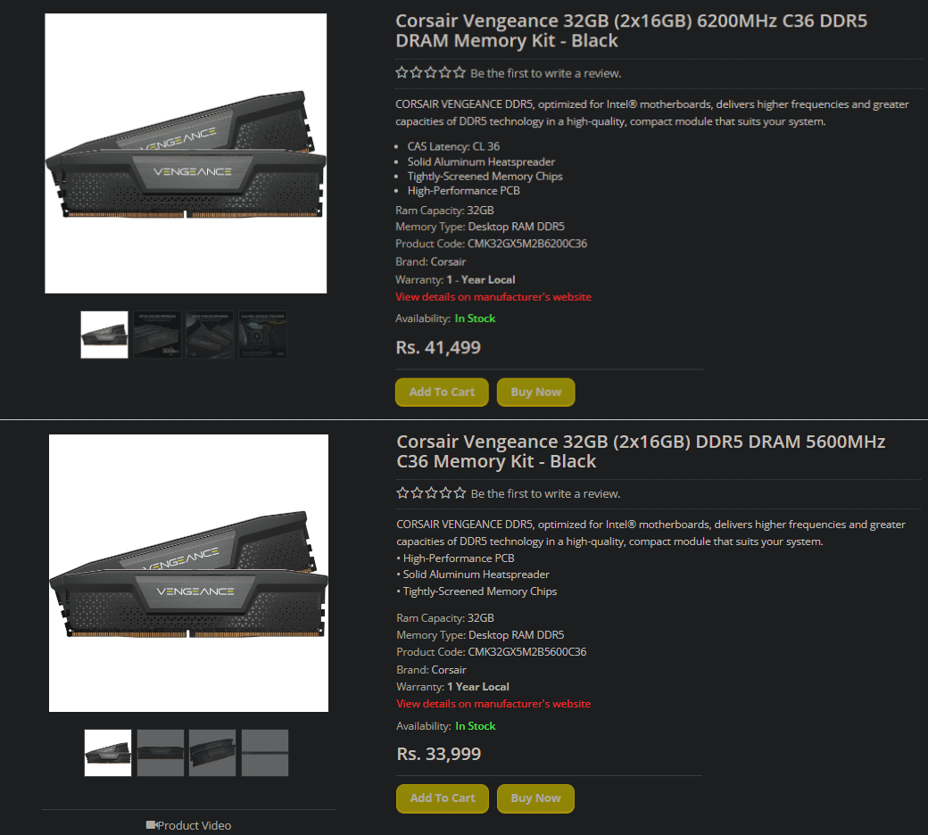 Two similar kits of Corsair Vengeance 2x16GB DDR5 memory have a 22% price difference only because the more expensive one is faster (5600MT/s vs 6200MT/s). So, faster RAM (with RGB of course) not only impacts your PC’s performance but also increases its overall value.
