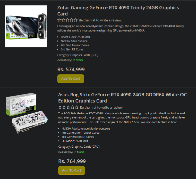 Is it really worth spending extra money on a supposedly “better” GPU model, even though the chip inside is physically the same? Take this example, the ZOTAC Trinity RTX 4090 costs 574,999 PKR ($2068). The same shop sells the ASUS ROG STRIX RTX 4090 for 764,999 PKR ($2751).