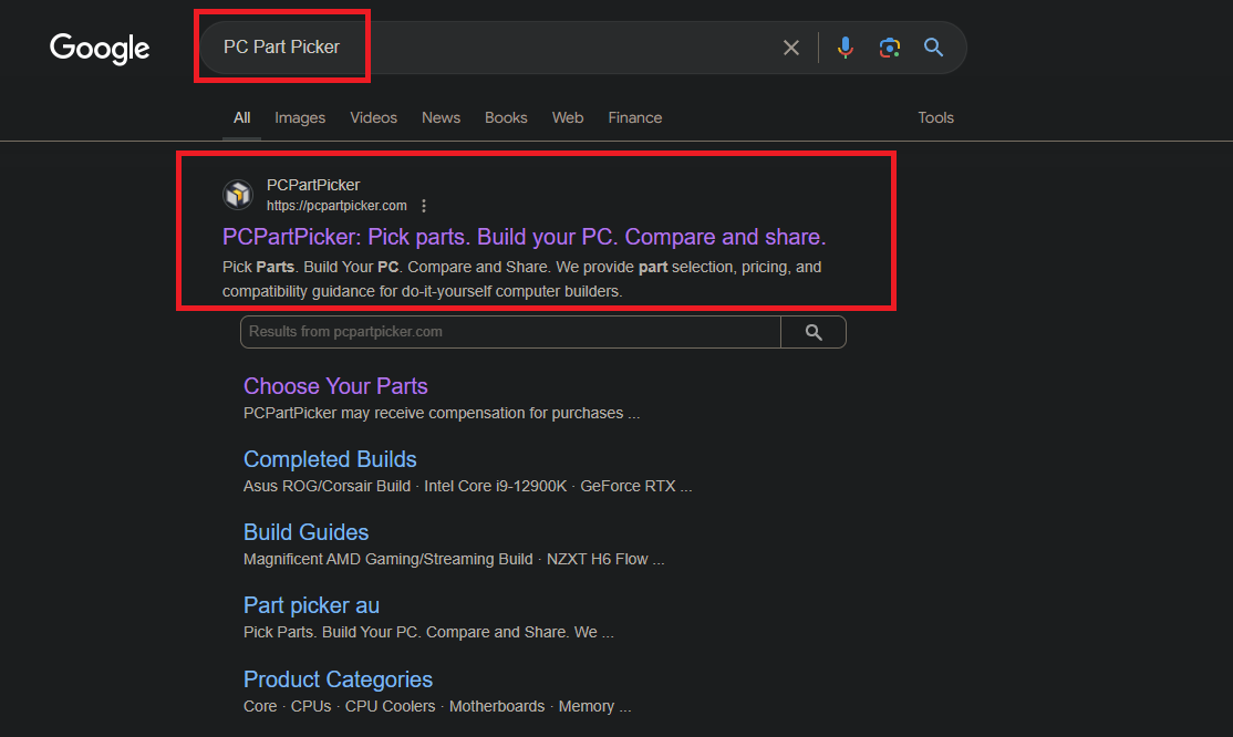 - Search the term “PC Part Picker” on Google. Make sure you double-check the URL; “https://pcpartpicker.com“
