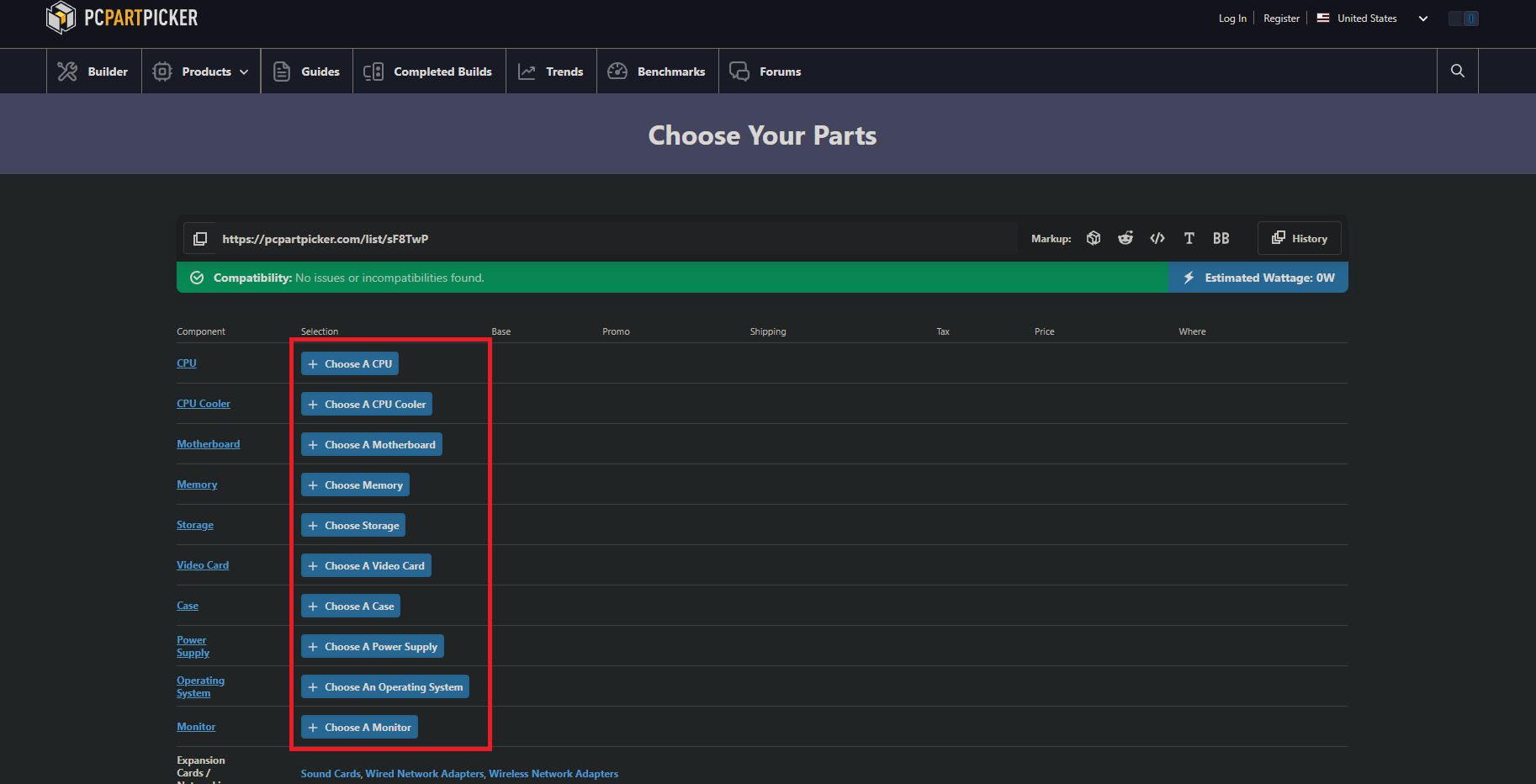 - Once you’re presented with the interface, select all the parts inside your PC in the respective fields. Be mindful to add the correct models, as they have a substantial impact on the price.