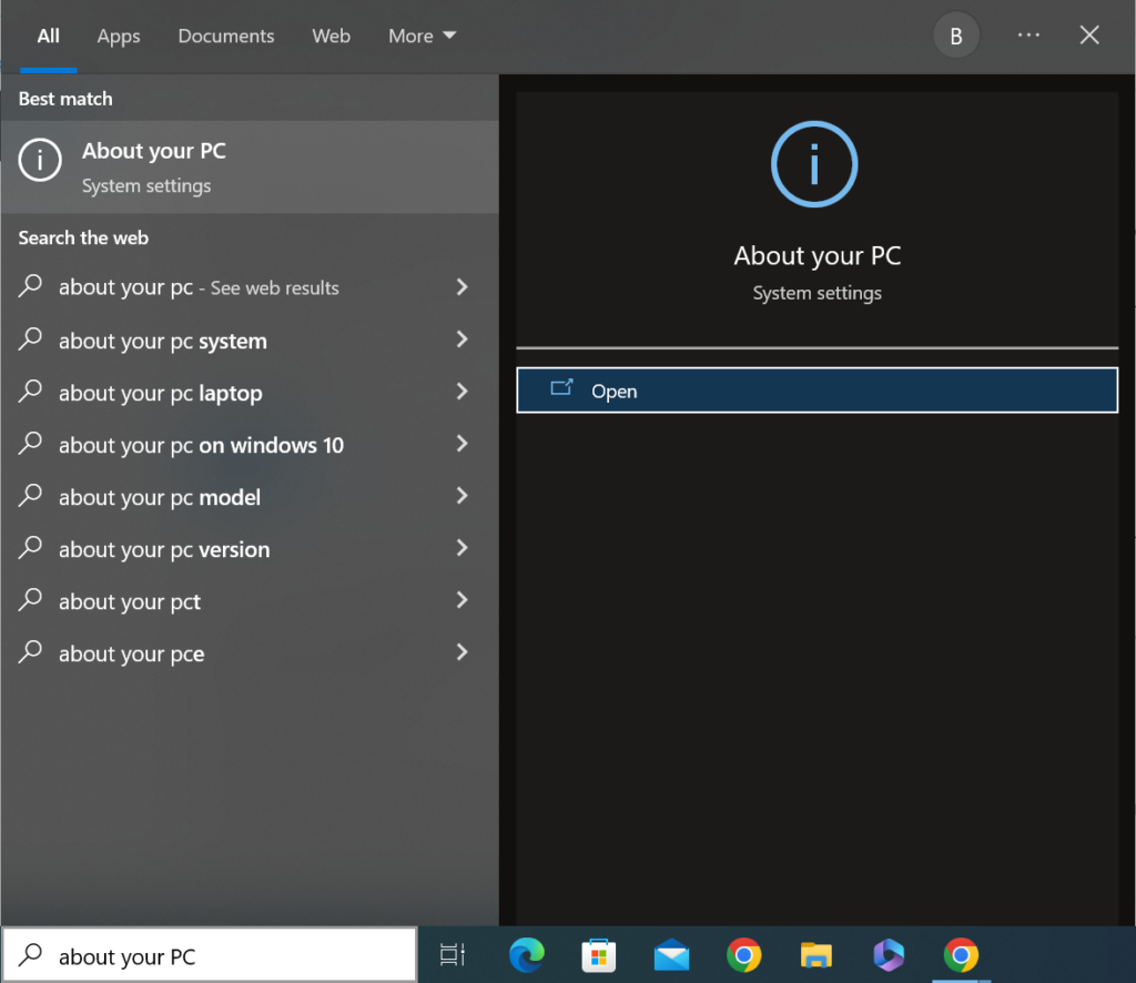 In the case of Windows systems, including Windows 10 and 11, you can simply type About Your PC on the search bar and access it from the top of the list.