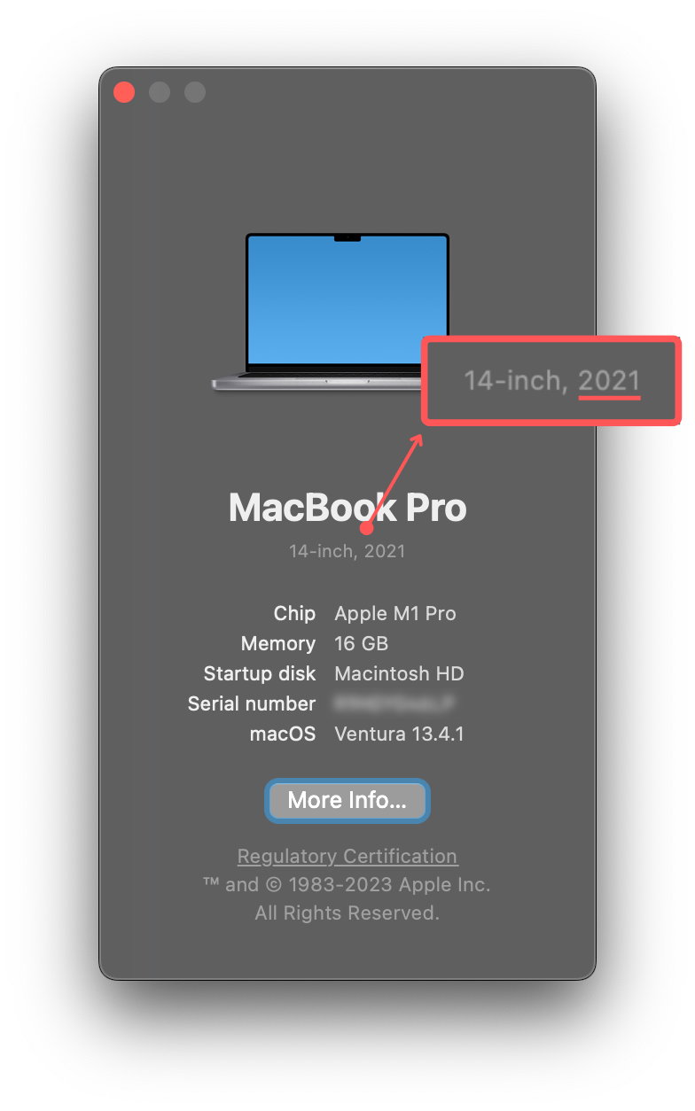 Your Mac’s release year - On this page you’ll be able to check some more tidbits about your device, such as the screen resolution and storage size.