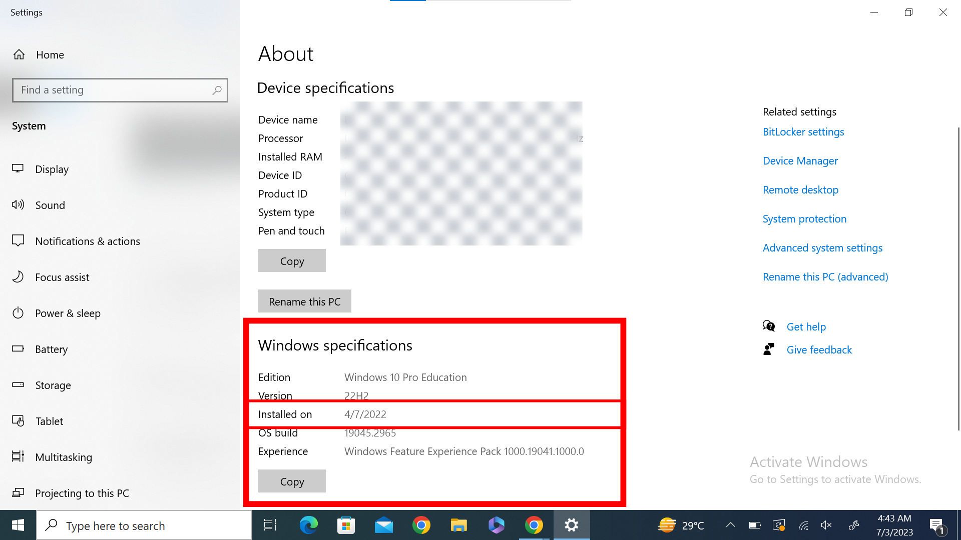Under Windows Specifications, you will find the Installed-On section. This will tell you when the operating system was installed on your PC. Ideally, this is quite close to the date on which your system was manufactured or first used.