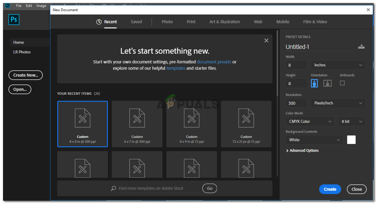- Starting from scratch. Open a new file on Adobe Photoshop CC 2018 and press the blue create button.