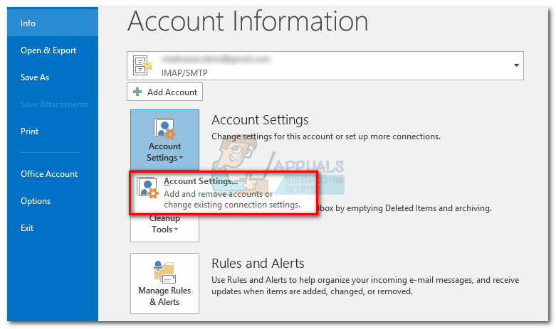 - Switch to Outlook and go to File > Account Settings and choose Account Settings from the drop-down menu.