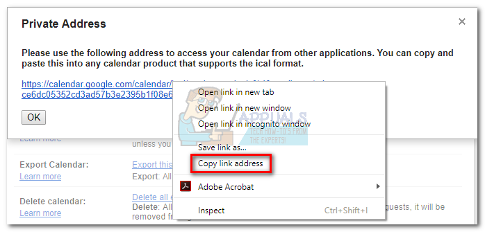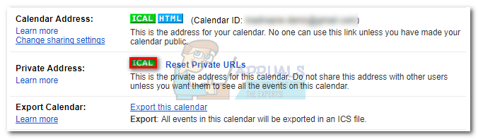- Scroll all the way down to Private Address and click on the iCal button.