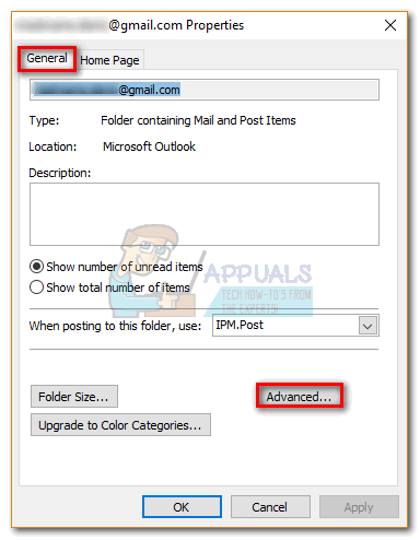 Note: In Outlook 2007, go to File > Data File Management and open Account Settings. - Once you’re inside the Properties dialog, select the General tab and click on Advanced.