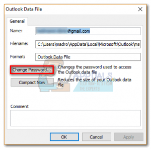 Note: In Outlook 2007 select the Data Files tab, then click on your PST file to select it. Finally, click Settings to open the Data file dialog box. - Now, you should see an overview of your Outlook Data file. Click on Change Password.