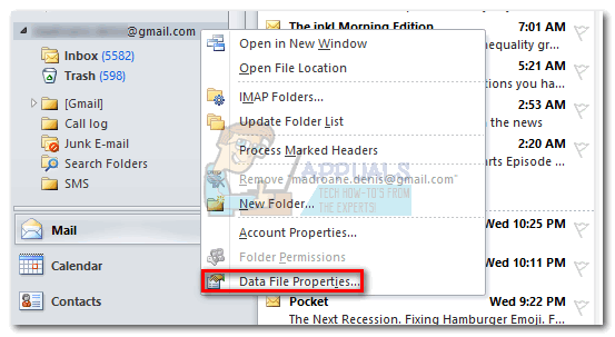 - Open Outlook and make sure your left pane is active. Right-click on your email account and click on Data File Properties.