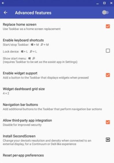 Download and install the Taskbar app from the Play Store on your Chromebook. Open the app, and navigate to Advanced Features under Settings. Here, make sure the boxes ‘Replace home screen’ and ‘Enable Widget Support’ are ticked.