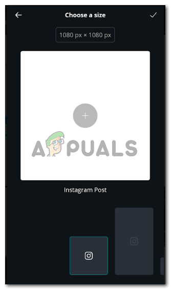 This blue Plus sign is what will lead you to the artboard or the canvas as you may call it, to begin with, your designing. - Make sure of the size that you choose because every social networking forum requires a different size for their posts. The sample templates are available on Canva which gives the templates a name according to the size. This helps the user in choosing the right size for the right forum. Once you have chosen the size, you can tap on the tick tap that appears on the top right corner of the screen of your phone.