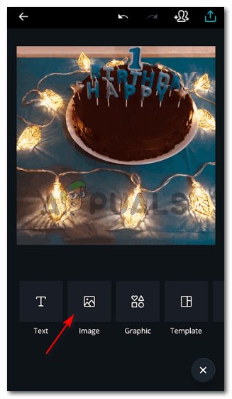 To add another image on the current image, you need to click on this icon. The plus sign again, but this time, it will work differently. - You will be directed to another page of settings which will show you the headings for Text, Image, Graphics, Templates and more as you swipe towards the right of the screen. But to add a watermark, you don’t need to swipe to the right, just tap on the icon/tab/heading for Image, which is the second one from the left.