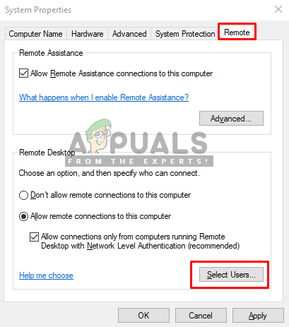 Opening Run and typing SystemPorpertiesRemote - At the bottom of the pop-up window, you will find “Select Users”, open that