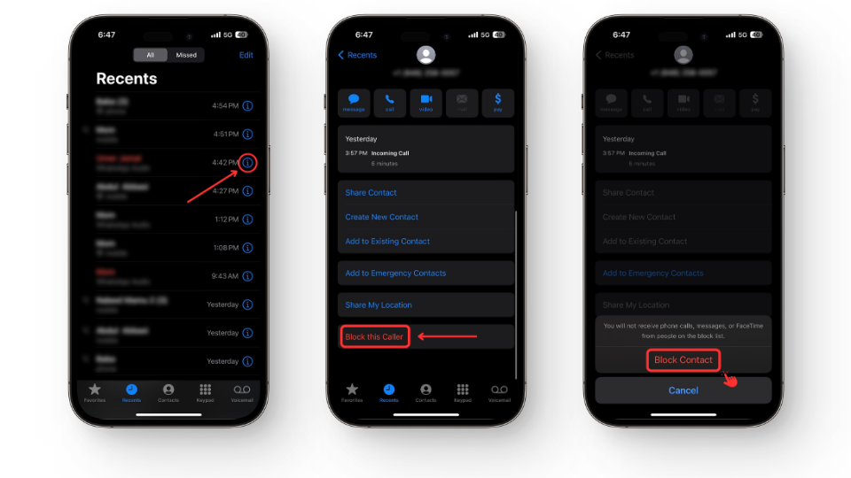 - Find the restricted or unwanted call you need to block and tap on the “(i)” icon next to it.