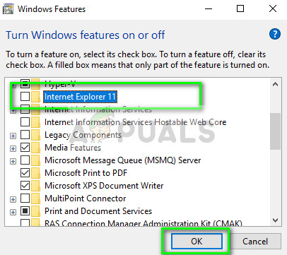 - Once in Windows Features, locate the entry Internet Explorer 11. Uncheck Press OK.