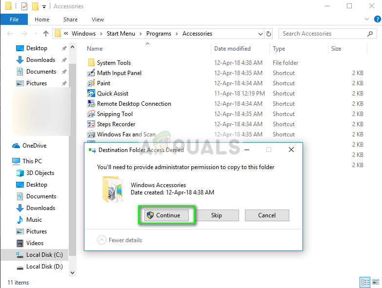 - Paste the shortcut in the directory. If you are prompted with a UAC as shown below, press Continue.