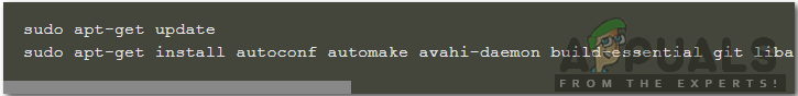 sudo apt-get update sudo apt-get install autoconf automake avahi-daemon build-essential git libasound2-dev libavahi-client-dev libconfig-dev libdaemon-dev libpopt-dev libssl-dev libtool xmltoman