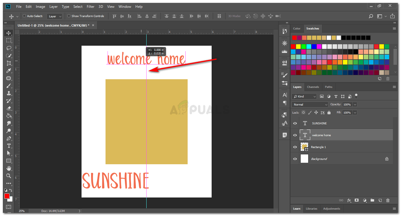Dragging the rulers. - Now, I will select the single layer that I want to center. For this, I will either click on the layer from the right panel or, press the control key and click the cursor on the text/layer I want to select. I will keep the cursor clicked on the selected layer and move it to the center. The minute it is in the center, the ruler line will turn pink, as shown by the arrow in the picture below.