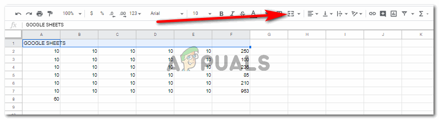 - On the top toolbar for Google Sheets, you will find a tab for merge which looks something like two square brackets and arrows in the center. Look at the image below to know what exactly the tab for Merge cells looks like on Google Sheets.
