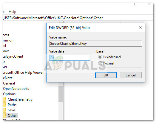 Note: Keep in mind that the exact location will be different according to your OneNote version. For example, the 16.0 folder is exclusive to Office 2016. If you’re using the desktop version of OneNote 2013, you should be able to find it in the 13.0 folder. - With the Other folder selected, move over to the center pane and double-click on ScreenClippingShortcutkey. Next, set the base value to Hexadecimal and then set the value data according to your needs. You can consult this list of virtual key codes (here) and pick a numeric value for the last key. For example, if you set the value data to 0x42 (or 42), the screen clip shortcut will be Win + Shift + B. Pick whichever key seems more convenable to your situation and make sure to hit Ok to save the changes.