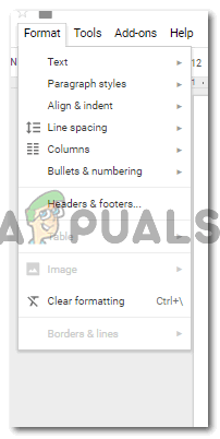 The formatting for the line you selected has been changed - Now, to implement all of the editings you made to this line, as the format for the whole document, you need to keep this line selected. Once it is selected, you should click on the tab for ‘Format’, which is on the top toolbar for Google Docs. A dropdown list will appear with various options for formatting.