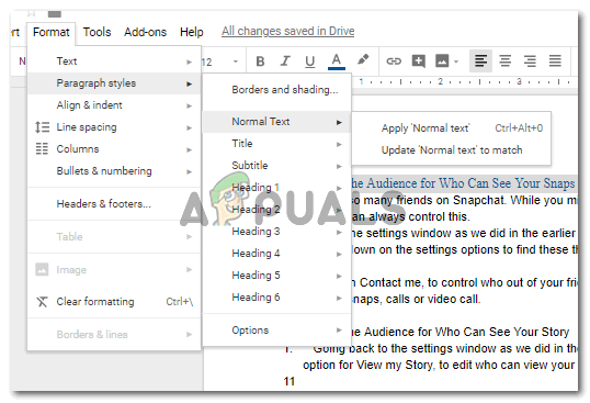 On the top toolbar, click on Format, Paragraph Style - Bring your cursor to the tab that says ‘Paragraph style’. This will open another extended list of options. From which you need to bring the cursor on ‘Normal Text’.