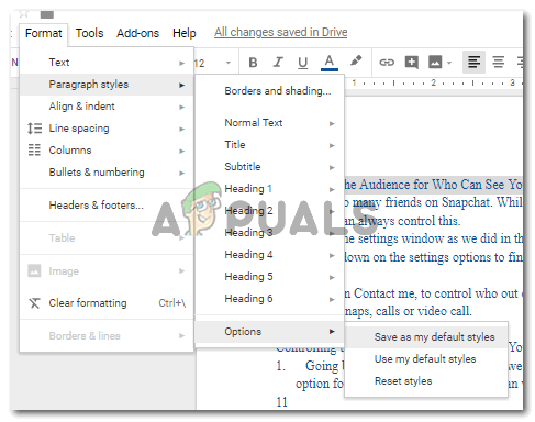 To make the formatting default, that is, making the document as per your preferred formatting A notification bubble will also appear at the top of the document, which will say ‘Your default style has been saved.’
