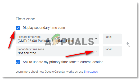 Gmail offers a number of time zones here. People belonging to different countries can scroll down the list here and find the region for their country, or the time zone that they are going to work according to. - Now, once the primary time zone has been selected, and if, you want to set up a second time-zone, you will first have to check the icon that is present right under the heading for Time Zone. Selecting this box here, as shown in the image below, for ‘Display secondary time zone’, means, that whatever the secondary time zone is selected by you, it will be visible to you on your emails, making your life a lot easier. Once you have selected the check-box for this option, you will notice that the drop-down list for the second time zone is now clickable. You can click on the downward-facing arrow on it, and select the second time zone for your emails.