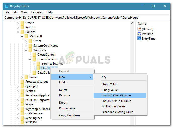 - Next, we are going to create two separate values inside the QuietHours key. To do this, right-click on the QuietHours key and choose New > DWord (32-bit) Value and name the new value EntryTime. Then, create the second DWORD value using the same procedure and name it ExitTime.