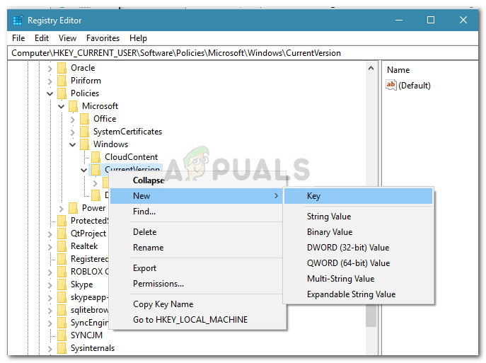 - Next, right-click on the CurrentVersion key and choose New > Key to create a new key and name it QuietHours.