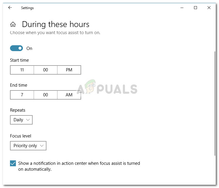 - You can set custom hours when you want Focus Assist to be automatically enabled by clicking the During these times. In the During these hours screen, you can set the Start time and the End time along with the Repeat frequency and the Focus level. Once you configure everything according to your preference, make sure that the toggle at the top is set to ON, then hit the back arrow to return to the previous screen.