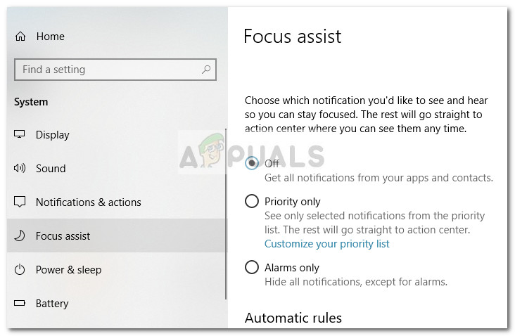 Method 1: Changing the Focus Assist Automatic rules in Windows 10