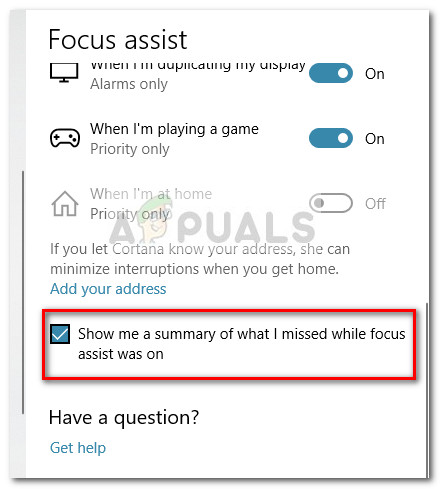 Note: Keep in mind that this option might not be available depending on your location. - Finally, you can check the box associated with Show a notification in action center when focus assist is turned on automatically. This will provide you with an overview of the things you missed every time you exit Focus Assist.