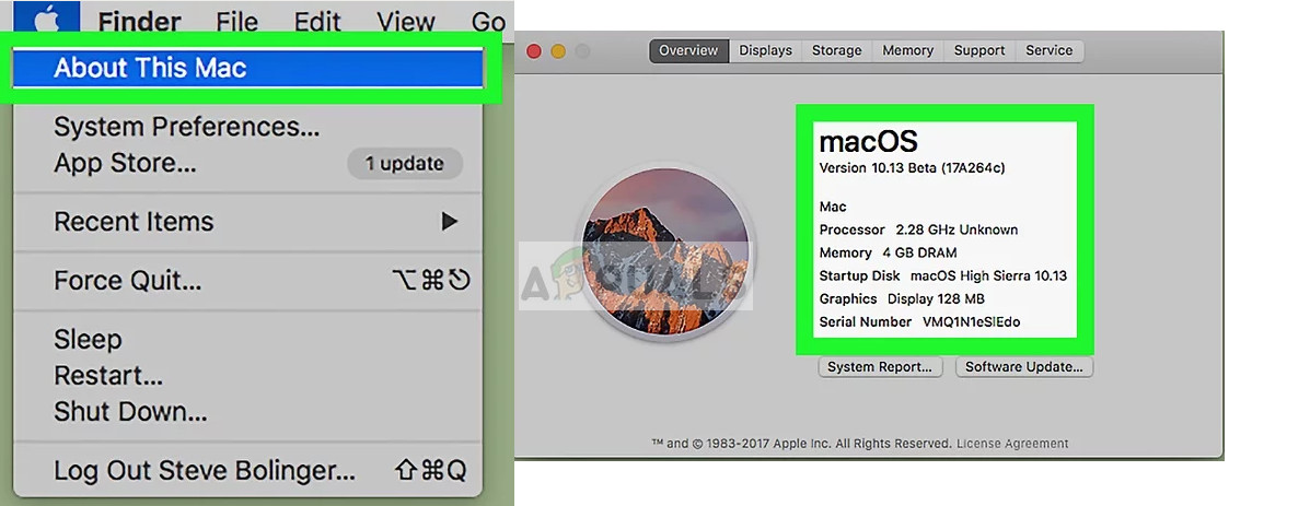 - Click on the Apply button at the top left side of the screen and select About this Mac. In the next window, all the general information will be displayed.