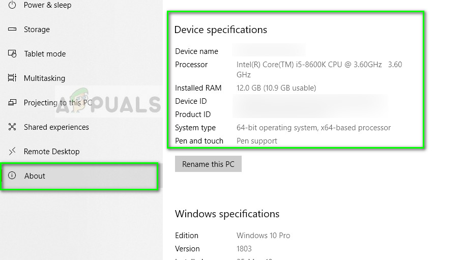 - Now click About from the left navigation pane. Here underneath Device specifications, you will find an overview of your computer. The Device name, Processor, RAM, etc. will be listed. In this case, the RAM is 12 GB and the processor is i5-8600k (overclocking enabled) with each thread at 3.60 GHz.