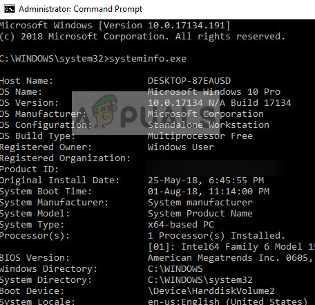 - Once in the command prompt, execute the command “systeminfo.exe”