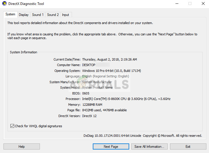 DirectX diagnostic tools also provide detailed information about your computer’s specifications and also gives detail about the display and sound properties under the same window. This method is more useful if you are investigating display crashing issues and need to determine the exact DirectX version along with video settings.