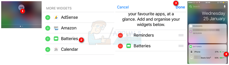 Checking power levels of PowerBeats 3 through iPhone notification center - You should see a green Batteries Tap this entry and it will list the widget at the top of your Today screen in the Notification Center. Tap Done on the top, right-hand side of the screen.
