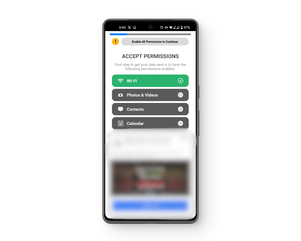 The next step is to allow permissions for all the different sorts of data present on your device. This includes your contacts, files, images, and calendar events. Keep in mind that allowing permissions to these areas of your phone can be incredibly sensitive and dangerous.