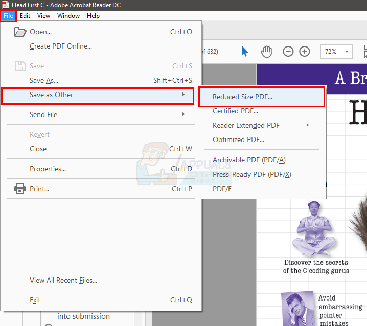 - Select File then go to Save as Other and select Reduced size PDF…